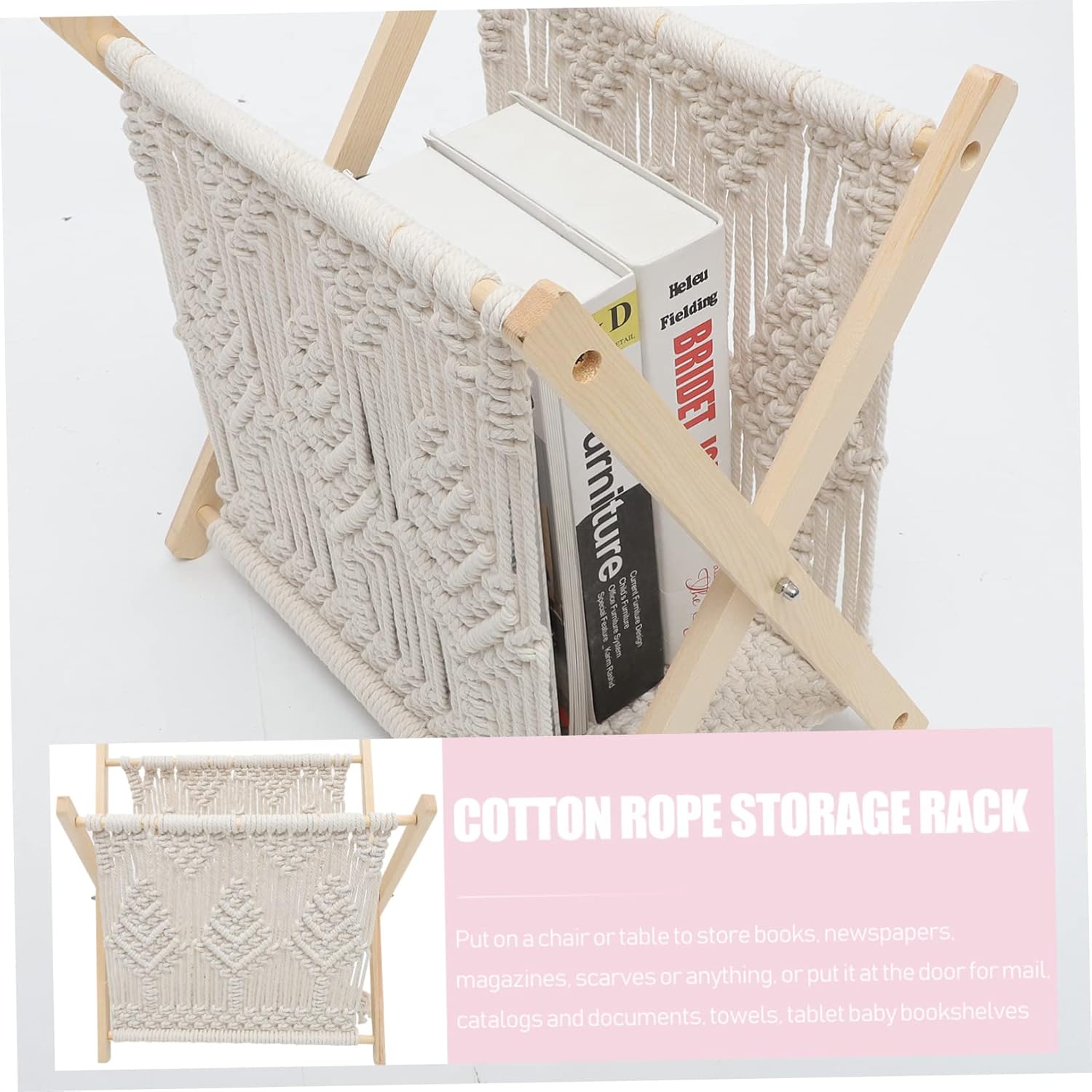 Package Include 1 x storage rack Features - Material: Wood, cotton rope, iron Woven Newspaper Rack - Size: 37.00X26.00X38.50cm;/14.54X10.22X15.13in; Rustic Woven Books Rack - Color: Beige Decorative Magazine Rack - Simple and modern shape that looks great on any table. Suitable for different indoor style collocation Home Magazine Rack. - It features a compact stand design, so it is easy to place on a table or table Books Rack. - for holding newspapers, magazines, cookbooks, idol albums, menus, etc Rustic Woven Newspaper Rack. - Save space for places with small space. Match your room decoration style Storage Holder. - Come with standing holder, strong and adjustable, can stably stand and firmly hold your things, convenient to use and easy to store it Desktop Storage Rack.Goods DescriptionDesktop Rack Woven Meanwhile, it owns a simple but attractive appearance design.Magazine Rack We adopt -end , can keep it for a long time.Magazine Rack Woven It would be your home decor for you.Woven Newspaper Rack If you are looking for a special storage rack with reliable and reasonable , I will tell you that our rack will be