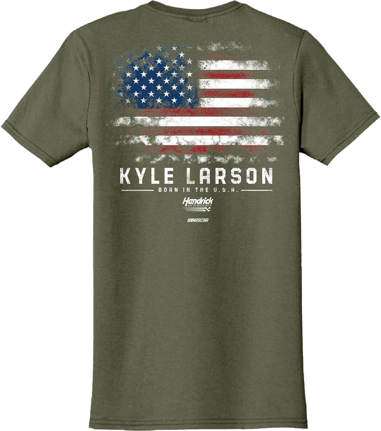 Show your NASCAR pride with this officially licensed Kyle Larson #5 Born in the USA T-shirt. The military green base color provides the perfect backdrop for the striking distressed American flag design that dominates the back. Featuring Larson's iconic #5 and signature on the front chest, this premium t-shirt celebrates both racing heritage and American spirit. Crafted from 100% ringspun cotton, this shirt offers superior comfort and durability for race day or everyday wear. The classic crew neck design and quality construction ensure a comfortable fit that maintains its shape through repeated washing. The distressed printing technique gives the graphics an authentically weathered look that pairs perfectly with the patriotic theme. Whether you're heading to the track or showing your team spirit around town, this shirt lets everyone know you're a dedicated fan of the #5 team.