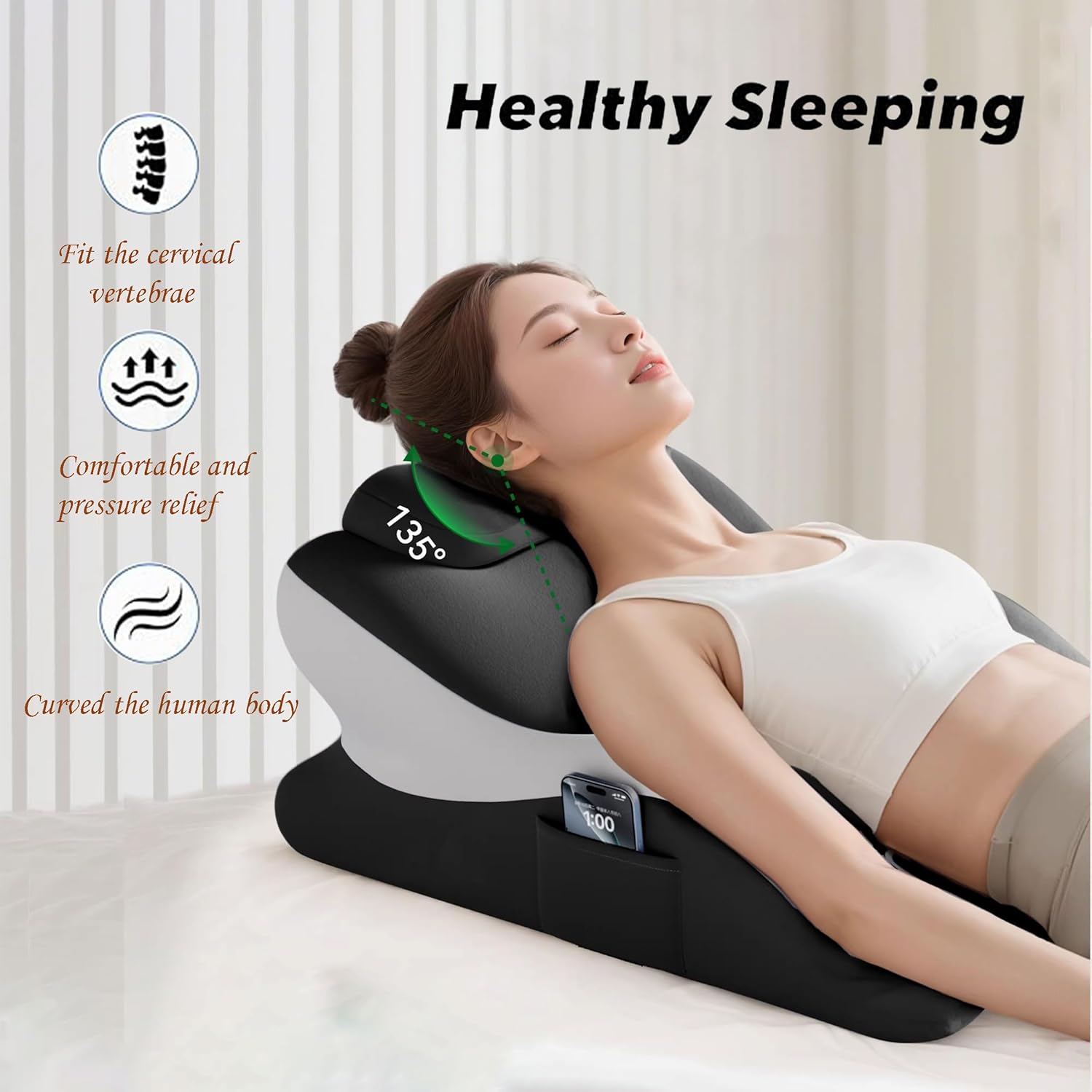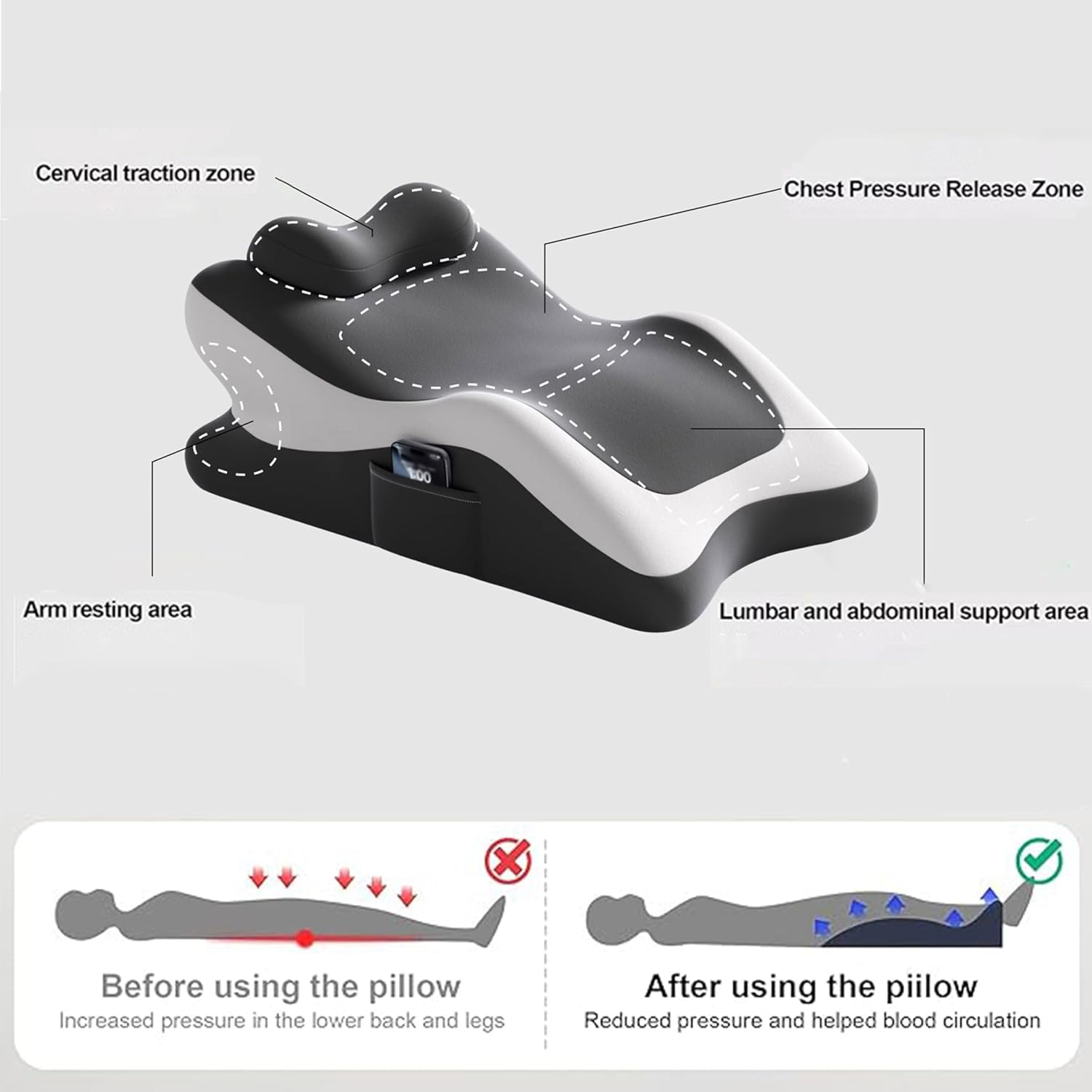 Elevate your daily comfort with this ergonomically engineered position pillow, crafted to deliver targeted support and lasting relaxation for your body’s every need. Made with premium high-density memory foam and sized at 23.6 x 14.1 x 8.6 inches, this versatile cushion offers precision support across key body areas, featuring a dedicated cervical traction zone for neck relief, a chest pressure release area, and tailored lumbar and abdominal support to ease strain from prolonged sitting or lounging. Its contoured arm rest prevents shoulder and arm soreness, making it ideal for extended reading, binge-watching, or quiet relaxation time. Designed for customizable comfort, the pillow includes a removable headrest with a simple snap-button design—effortless to assemble and adjust to your unique posture preferences. Built with everyday practicality in mind, it boasts a non-slip bottom for steady placement on any surface, a soft ice silk cool fabric cover that’s fully removable and washable for easy care, and a convenient side pocket to keep small essentials like your phone, remote, or glasses within arm’s reach. The sleek black-and-white two-tone finish adds a modern, understated touch to any bedroom, living room, or cozy nook, blending seamlessly with your home decor. This multifunctional position pillow adapts to all your daily scenarios, serving as the perfect companion for reading, unwinding, meditating, or simply enjoying supported, all-day comfort at home.