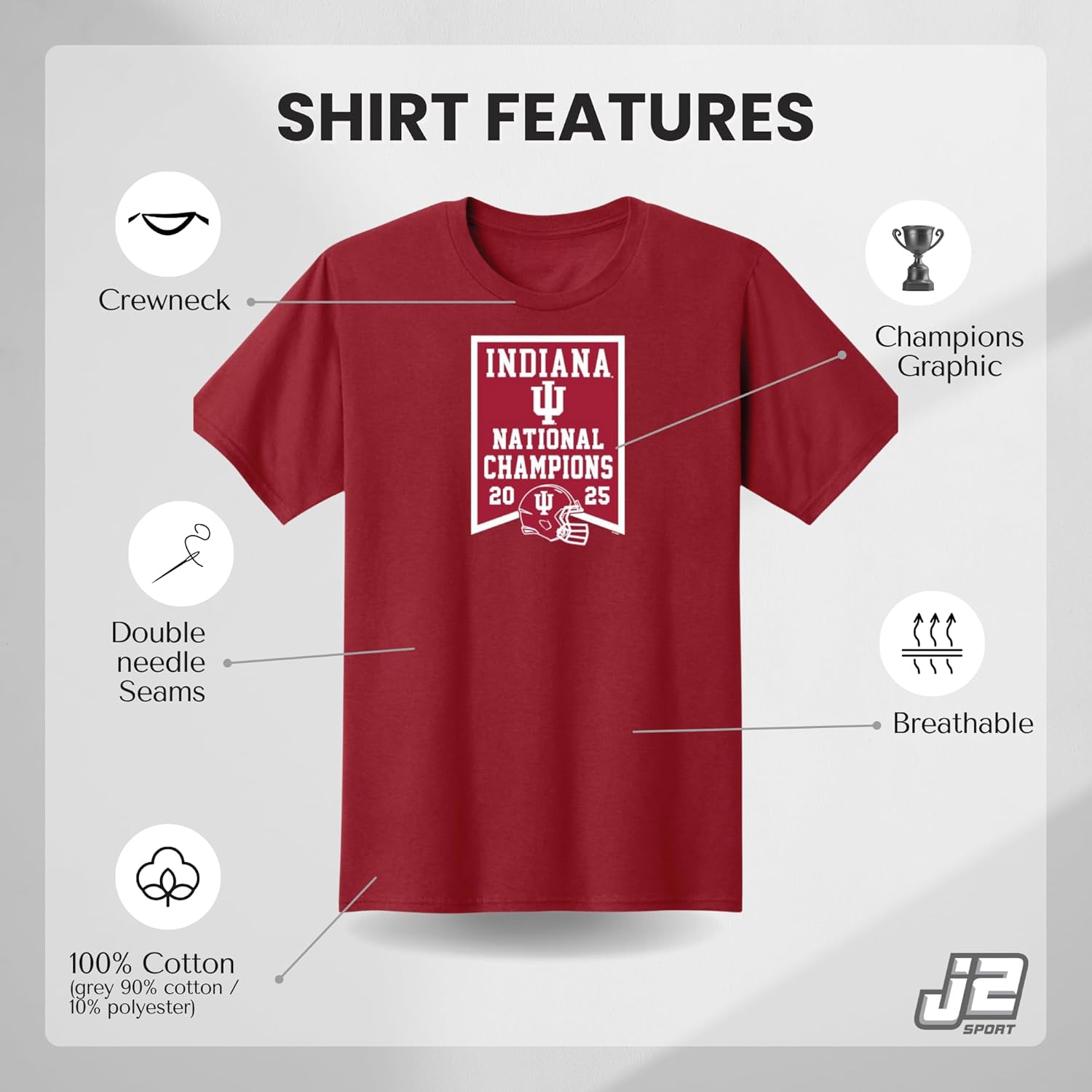 Our J2 Sport Indiana University football championship shirts are a great addition to your school pride collection. Whether walking campus or the streets, you will certainly be showing your true colors. Our shirts weigh around 5.3 oz and made with pre-shrunk 100% cotton. The lightweight team spirit cotton crew neck tee is breathable, soft, and durable to keep you cool and comfy on game day or hanging out with your fellow Hoosiers. This soft cotton short sleeve t-shirt has double-needle seams for reinforcement, crisp and bold graphics, and a unisex fit that is ideal for both men and women. The unisex college shirt is embellished with a high quality Indiana printed graphic for your school spirit. Great for tailgates, birthdays, games, or when you just want to show off your NCAA spirit. This is the ideal gift idea for any Indiana University alum, upcoming graduate, or NCAA fan. Designed and printed in Troy, Michigan USA.