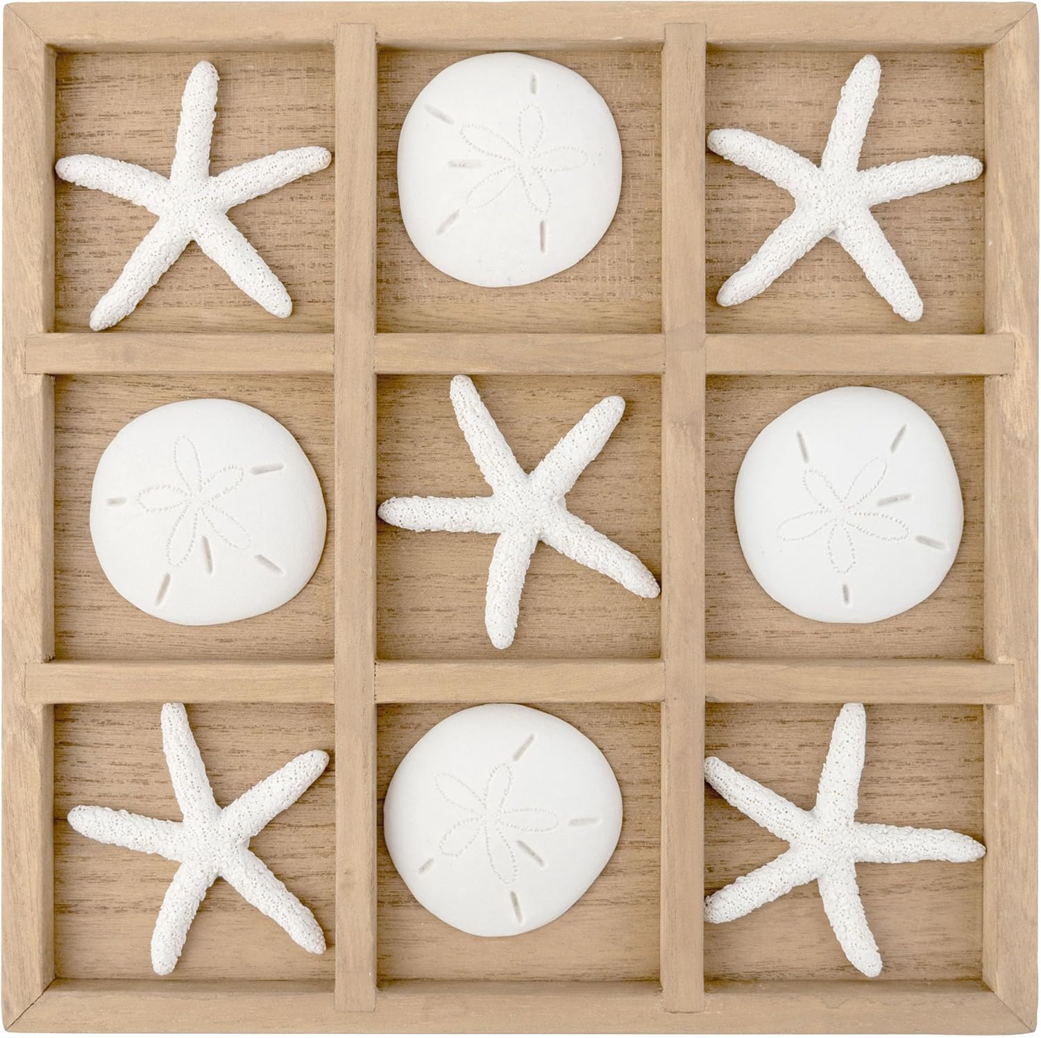 Our Beach Tic Tac Toe decor is the ideal complement to your coastal-themed interior, providing a distinctive and refined touch for your space. Crafted from a wooden base and adorned with seashells, this elegant piece exudes a timeless coastal charm. Elevate your decor with this premium addition, perfect for adding a touch of seaside elegance to your home. Details Includes 5 sand dollars and 5 star fish pieces Dimensions Approx. 10.5"L x 10.5"W x 0.75"H Materials Paulownia wood MDF Resin Care Tips Wipe clean