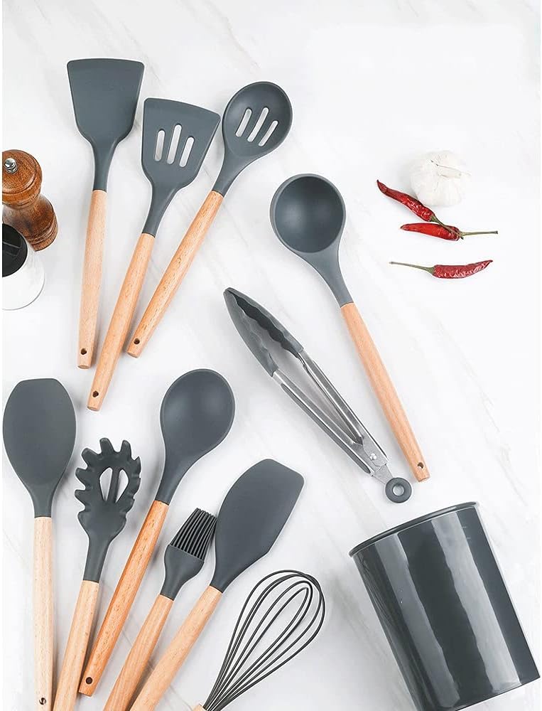 Name: 12-piece silicone kitchenware set Material: Food grade silicone Material: high temperature and heat resistance, no damage to the pot, not easy to deform, etc. Color: gray Silicone for food contac Not afraid of high temperature silicone Kitchen hanging hole storage Food grade silicone material Hanging hole design Meet the various needs of cooking