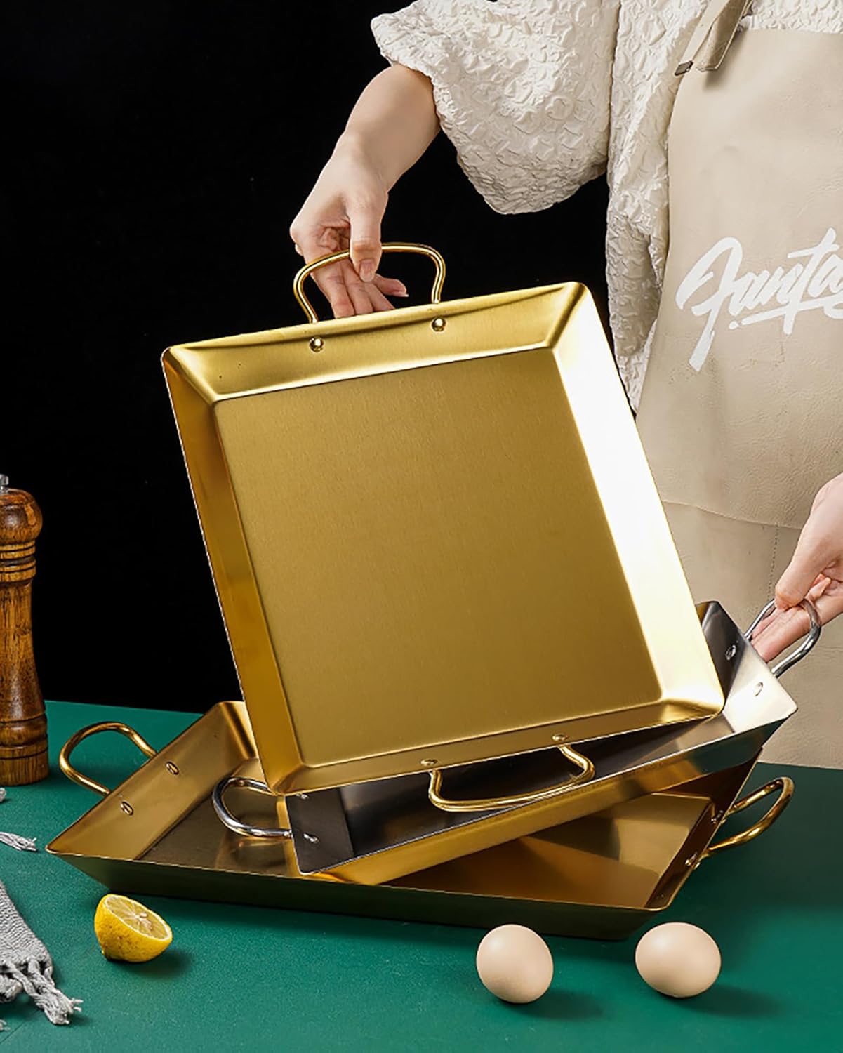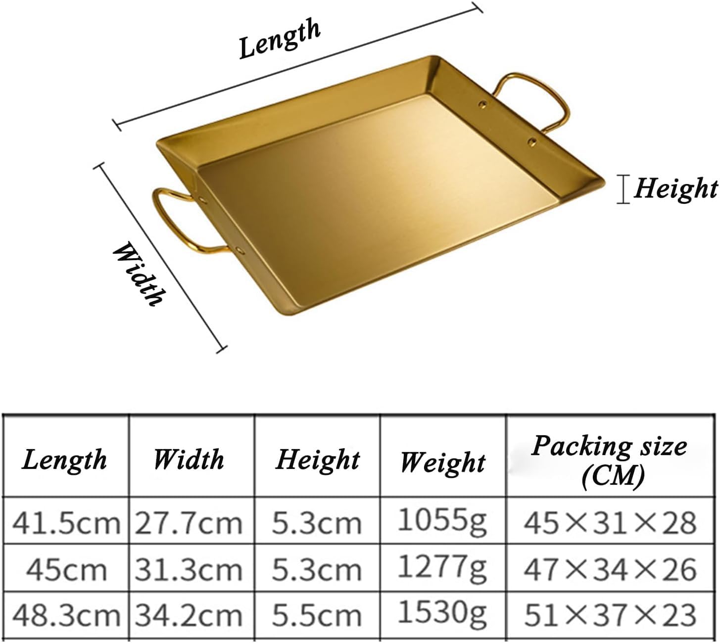 MultipurposeThese organizer trays serve multiple purposes, making them highly versatile. They are ideal for serving appetizers, snacks, or desserts. Additionally, they can be used to store cosmetics for daily use or be taken along for camping, picnics, self-service buffets, barbecue parties, or travel trailer mealsName: Square Seafood Dinner Plate with Double HandleMaterial: stainless steelProcess: PolishingApplication: home / restaurant / hotel, etc.Size:41.5cm: 41.5x27.7x5.3cm/16.33x10.9x2.08inch, Weight: 1055g45cm: 45x31.3x5.3cm/17.71x12.32x2.08inch, Weight: 1277g48.3cm: 48.3x34.2x5.5cm/19.01x13.46x2.16inch, Weight: 1530gPackage:Commercial Dinner Dishes Serving Platter x1