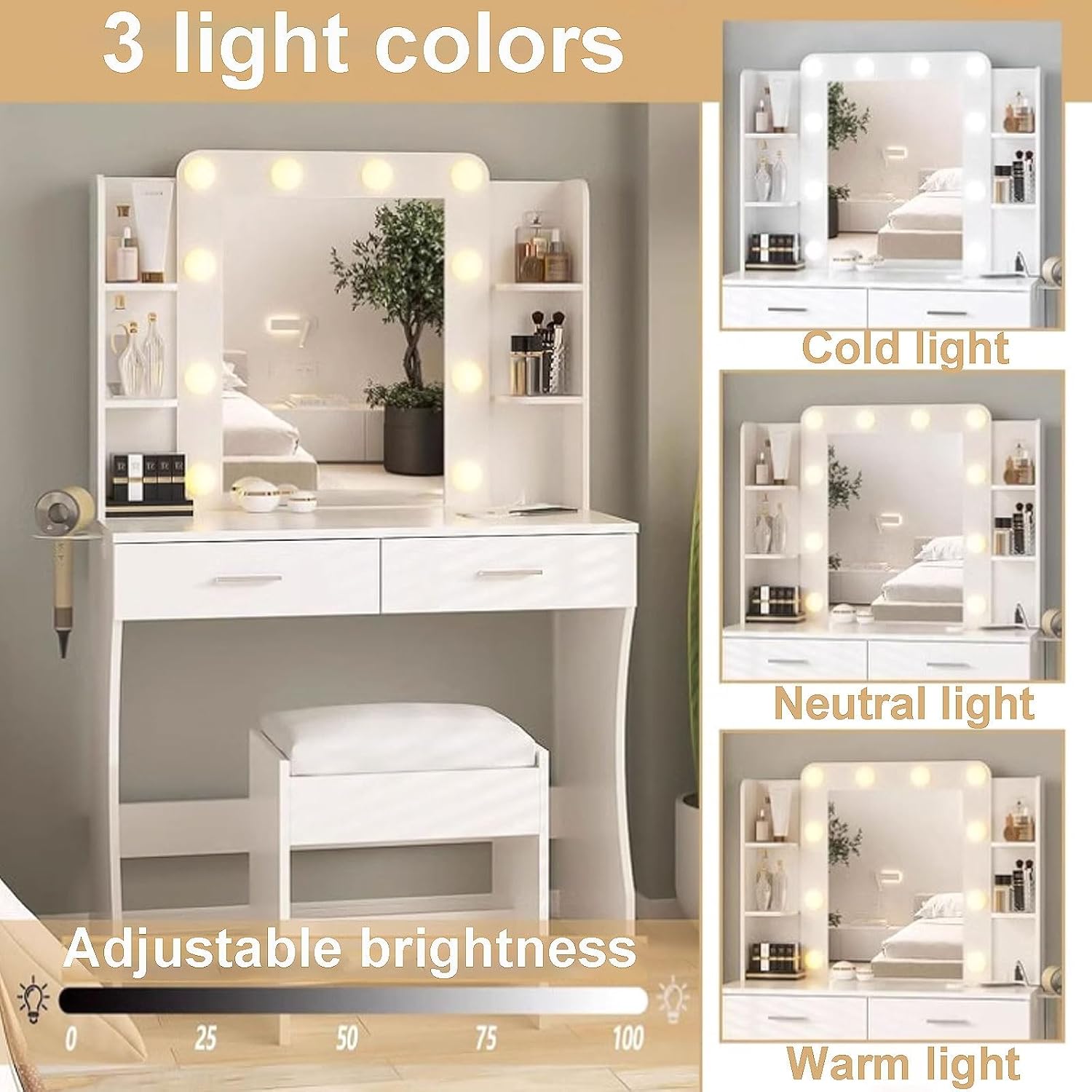 • 【Makeup】the light colors and brightness are adjustable, makeup vanity desk with lights could help you accomplish the apporiate makeup look every day