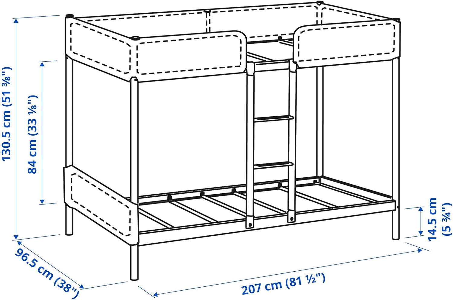 Key Features: By having a bunk bed instead of two single beds, you can free up square meters needed for play or other activities on the floor. The bed is lower than other bunk beds so you can easily make a bed and give your child a sleep hug. Great solution when space is limited. Center ladder for easy insertion and removal of bed Kids can put their own stamp in a small space by choosing their favorite bedding. Assembled Size: Max. Weight/Sleep Level: 220.5 lbs (100 Length:207cm Width:96.5cm Height: 51.2 inches (130.5 cm). Free height under furniture: 14.5cm Mattress Length: 200cm Mattress Width:90cm Max. Thickness, Mattress: 11cm Distance between beds: 84cm IMPORTANT NOTE: Please note that all orders from outside the EU may attract import duties and taxes. Check with post office or tax office for import regulations