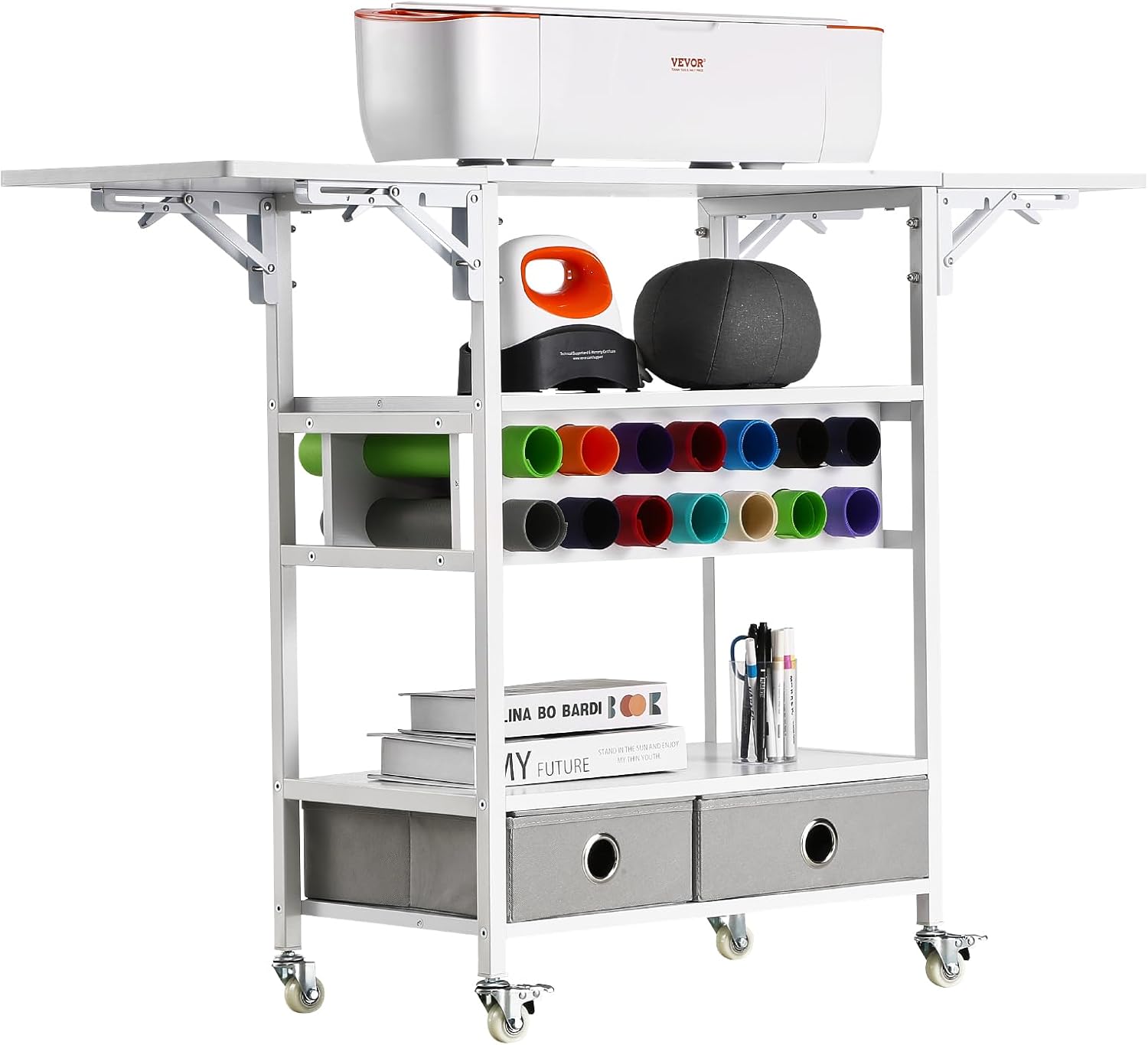 | Item Type Name | Compatible with Cricut Machines, Collapsible Cricut Table with Foldable Sides, Craft Rolling Storage Organizer with 14 Vinyl Roll Holders and 2 Drawers |